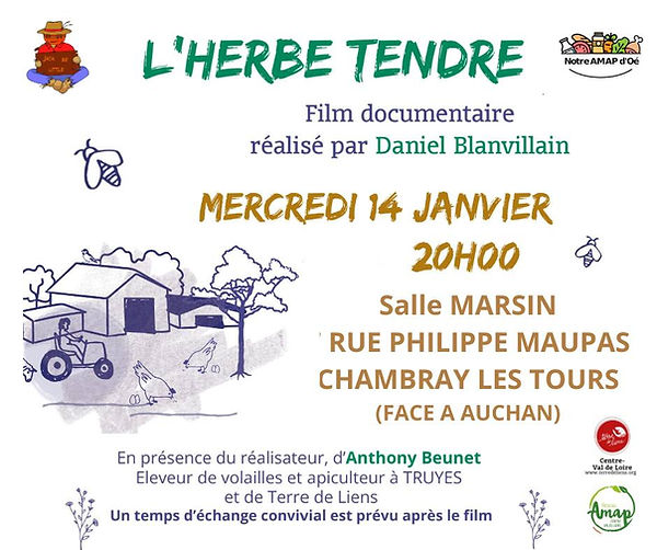Merci aux intervenants : Daniel Blanvillain (réalisateur du film), Anthony BEUNET (éleveur de volailles et apiculteur à Truyes) ainsi que Bernadette et Claire de Terre de Liens Centre Val de Loire
